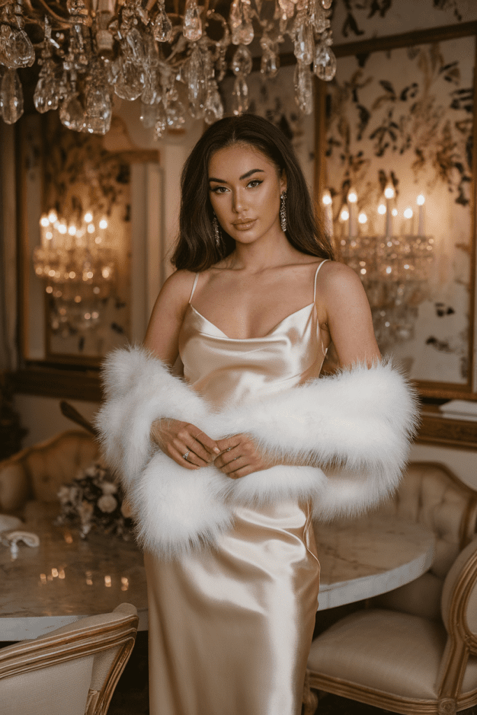 Bring on the drama with a slip dress and faux fur stole. The stole adds warmth and serious old-Hollywood energy.