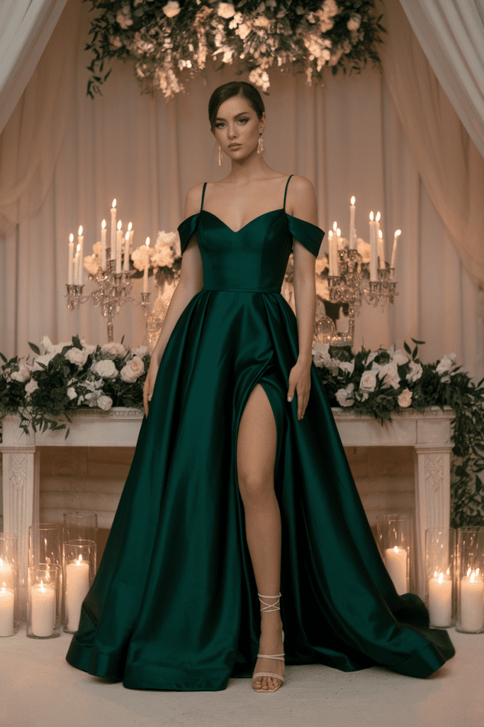 December doesn’t mean you can’t serve leg. A satin gown with a thigh slit is dramatic yet tasteful, especially in jewel tones.