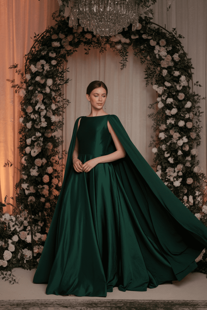This is your drama queen moment. A gown with a cape detail feels straight out of a red carpet. Bonus: it doubles as built-in warmth.
