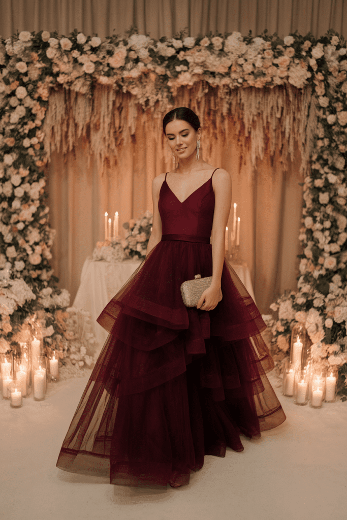 Tulle isn’t just for ballerinas—it’s for wedding guests who want drama. A burgundy tulle dress balances romance and winter elegance.