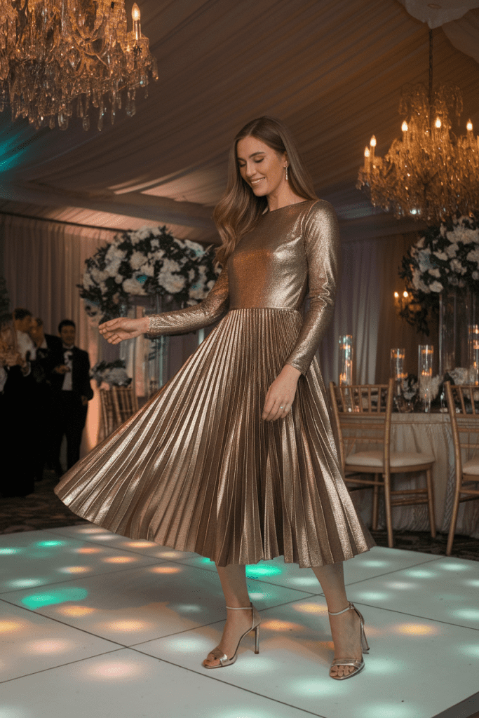 Nothing twirls like a pleated metallic midi dress. The shimmer catches every flicker of candlelight, and the pleats mean movement all night long.