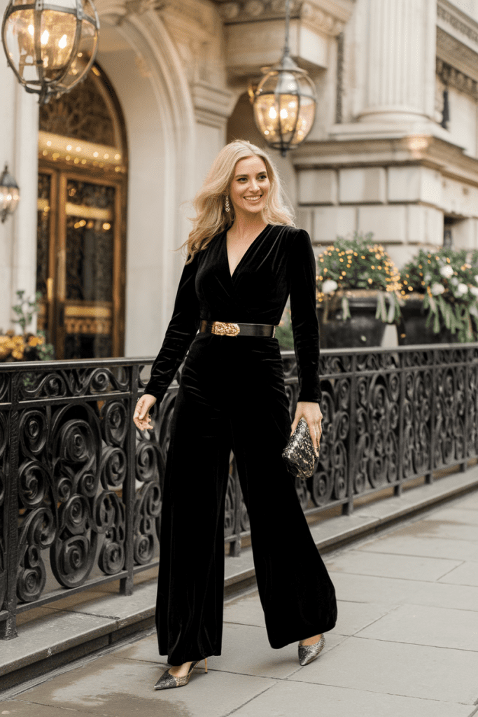Not in the mood for a dress? A velvet jumpsuit is your power move. Add a cinched waist belt and you’re serving disco-era glam but with modern polish.