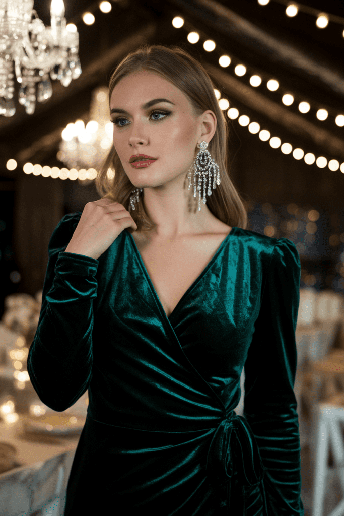 Velvet is basically winter’s unofficial uniform. A velvet wrap dress hugs you in all the right places and screams festive without even trying. Pair it with big, sparkly statement earrings and suddenly you’re the glamorous guest everyone secretly thinks is royalty.