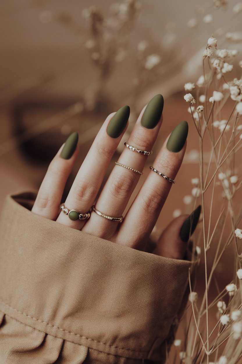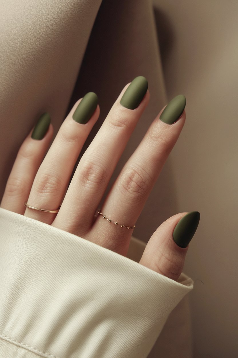 Matte olive green nails are the definition of quiet elegance.