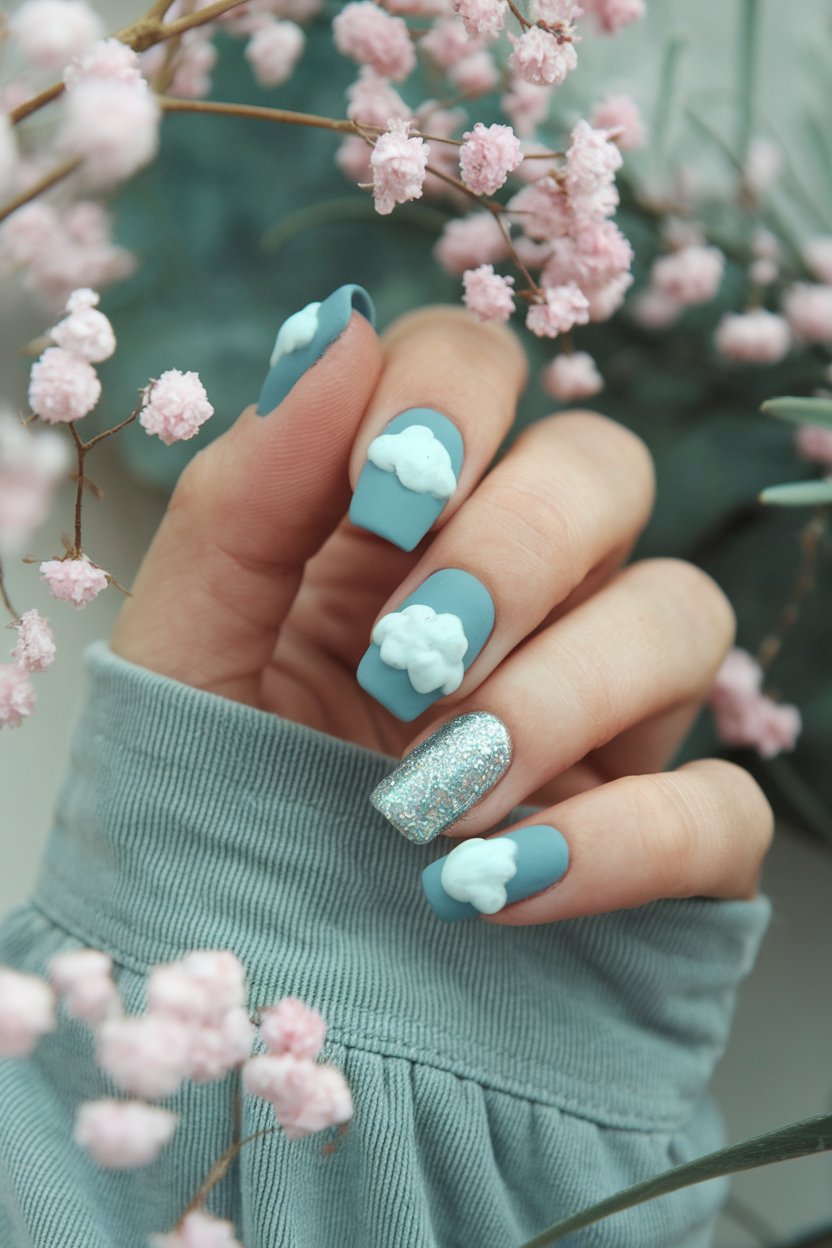 Matte dusty blue nails with soft white cloud accents create a whimsical, daydreamy vibe.