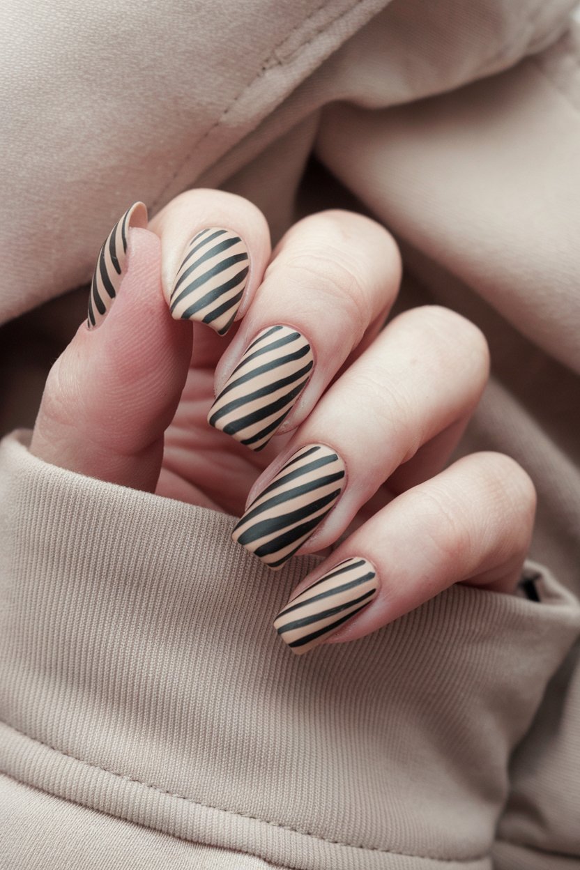 Matte beige nails with black diagonal stripes bring a sleek, modern edge that’s effortlessly cool.