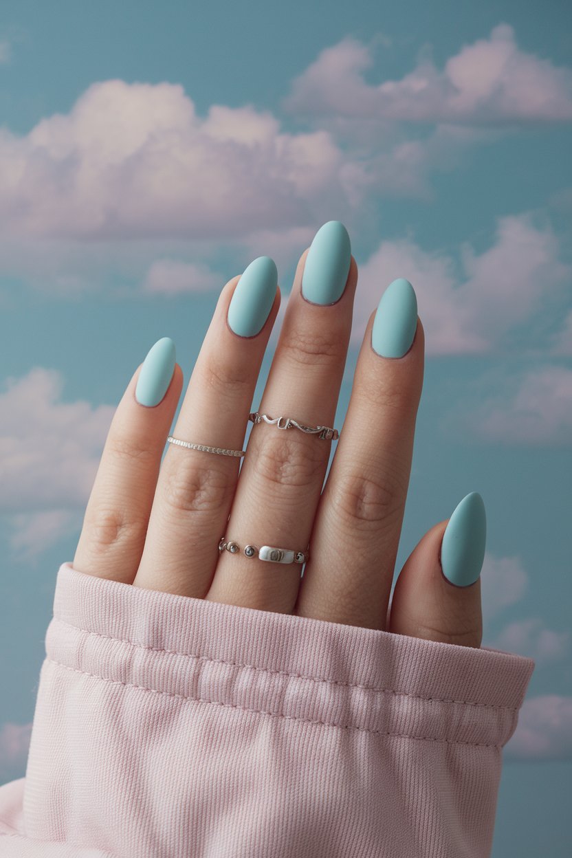 Matte powder blue nails are soft, soothing, and effortlessly elegant.