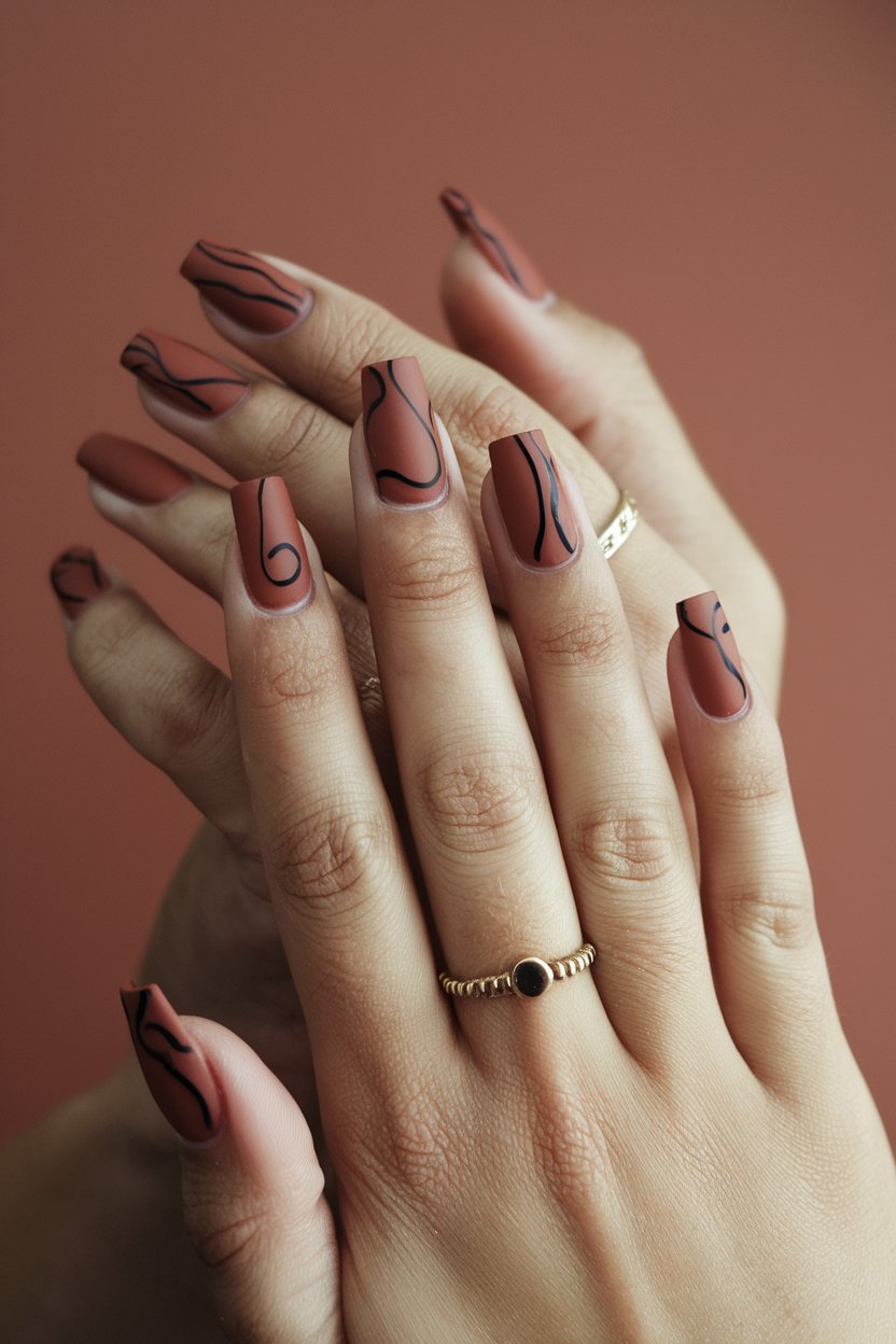 Matte terracotta nails with thin black freehand lines offer an effortlessly artistic look.