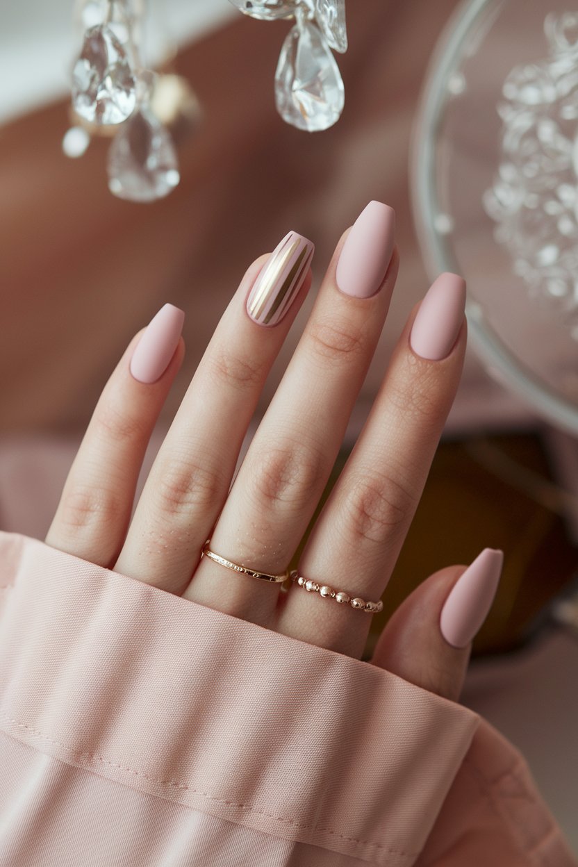 Matte blush pink nails with a single gold stripe bring instant, effortless elegance.