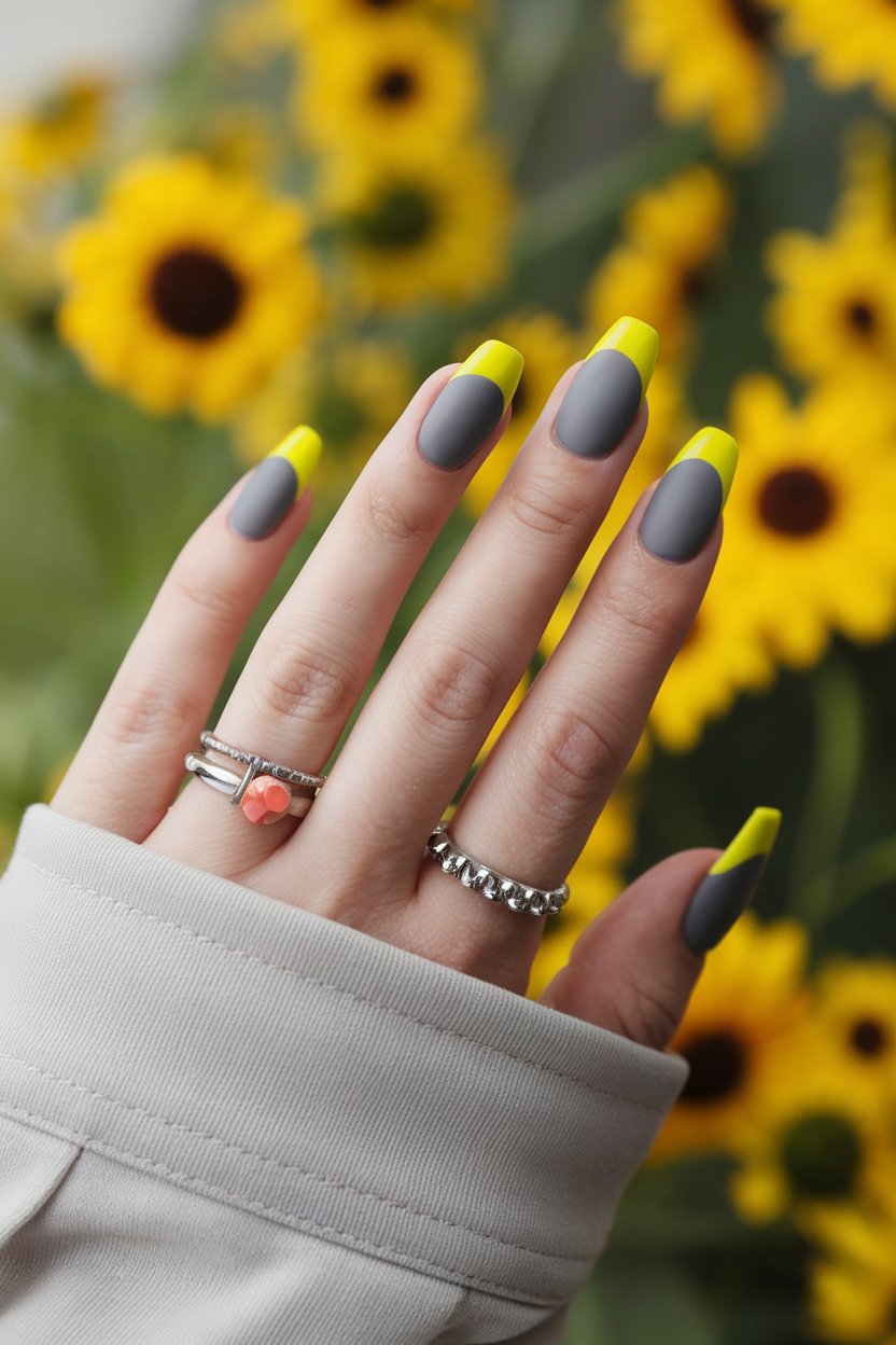 Matte gray nails paired with sunny yellow tips bring a cheerful spin to a classic neutral look.