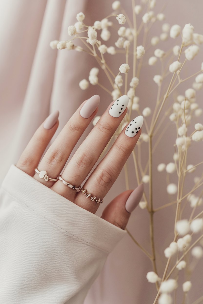 Matte white nails with tiny black dots strike the perfect balance between playful and polished.