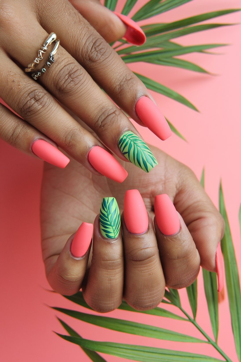 Matte coral nails with a single palm leaf accent bring a fun, tropical vibe that’s perfect for summer and beyond.