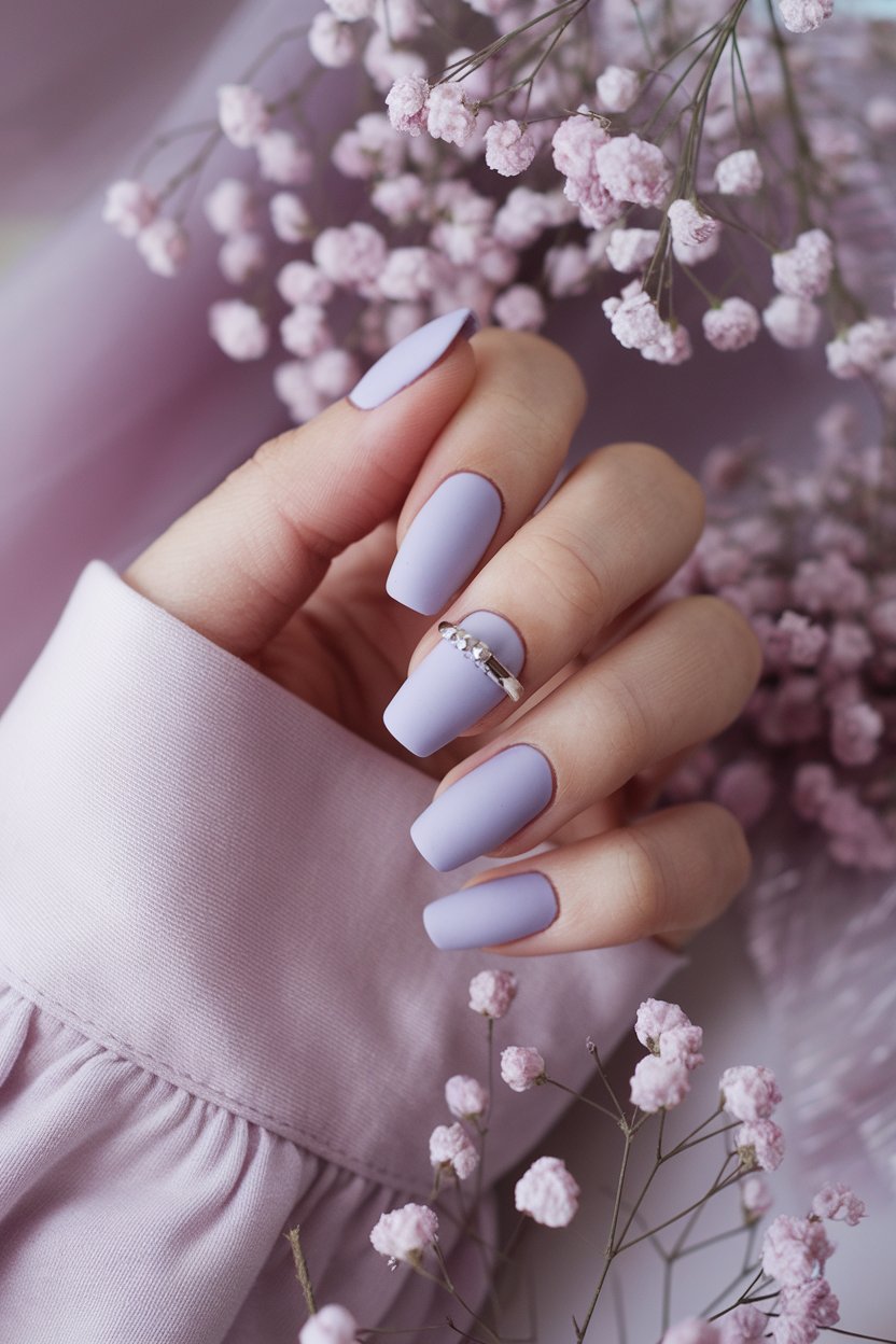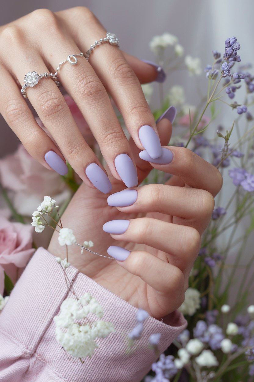 Matte lavender nails bring a soft, delicate charm that’s effortlessly pretty.