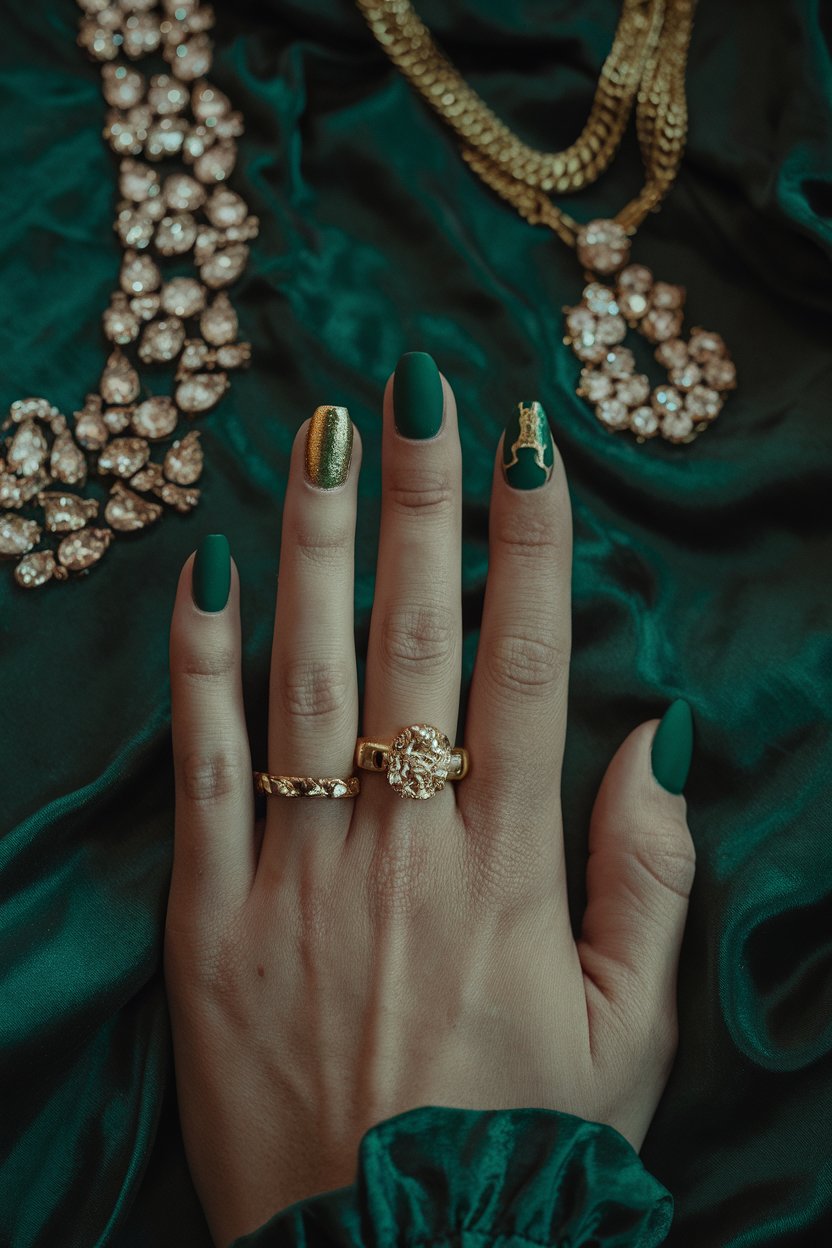 Matte forest green nails paired with gold foil accents bring major luxury vibes.