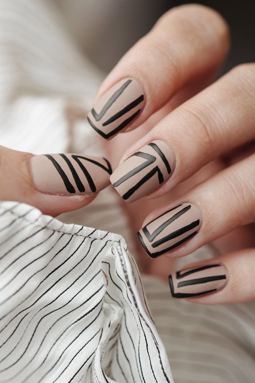 Matte beige nails with bold black diagonal stripes deliver a sleek, modern vibe that stands out with minimal effort.