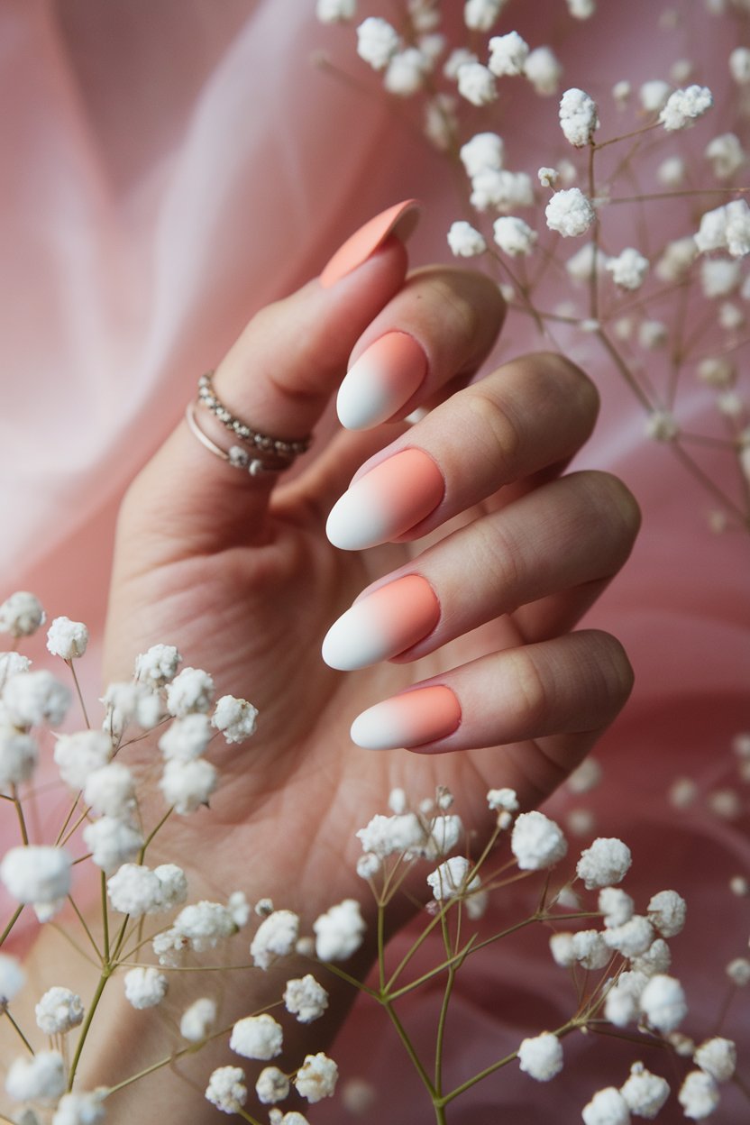 Matte peach and white ombré nails offer a soft, graceful look that’s perfect for a clean and elegant style.