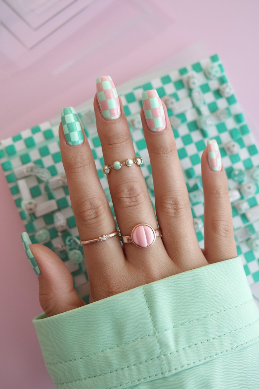 A two-tone checkerboard in pastel shades brings a perfect mix of fun and sophistication to your nails.