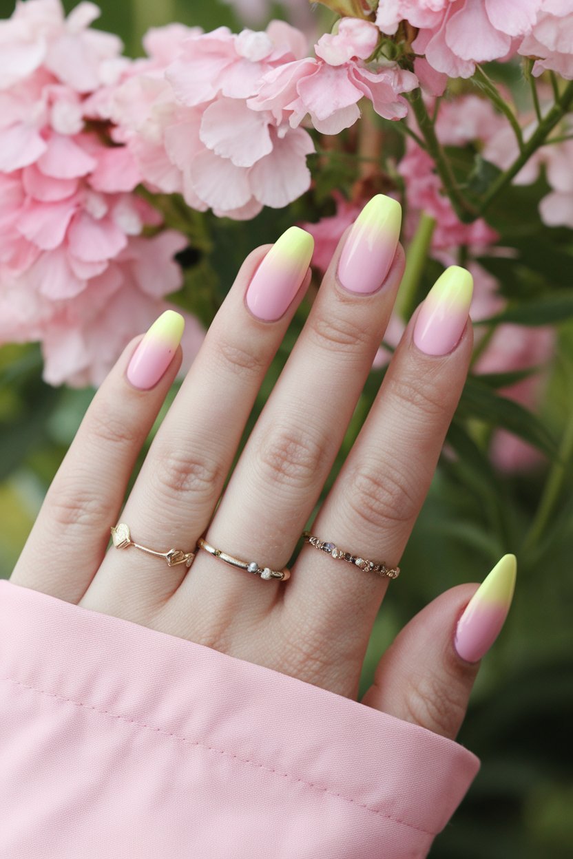 Ombré nails bring a touch of sunset magic to your fingertips. Try blending two gentle shades like pink and yellow for a soft, dreamy effect.