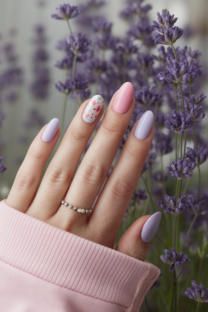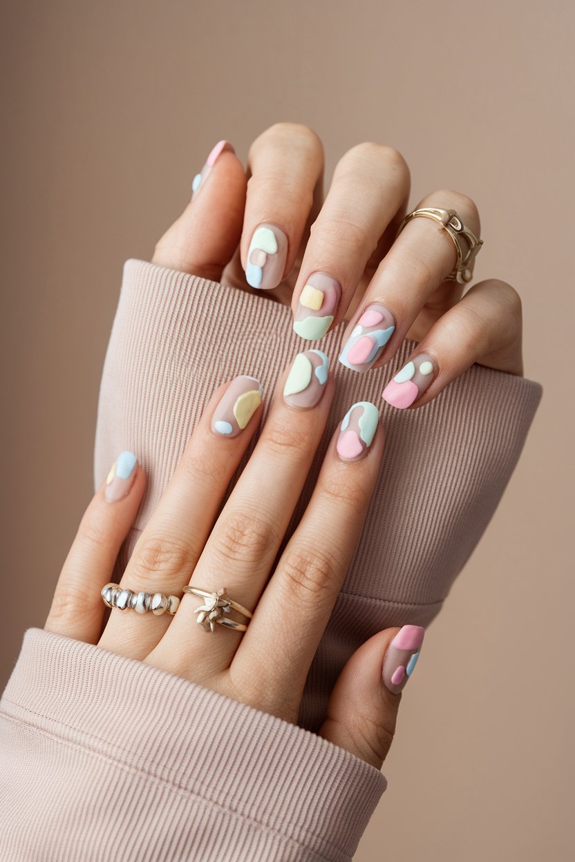Try placing a single pastel circle near the cuticle, a diagonal stripe across the middle, or tiny geometric accents scattered over clear polish. The negative space gives your nails breathing room and makes the pastel tones pop even more.