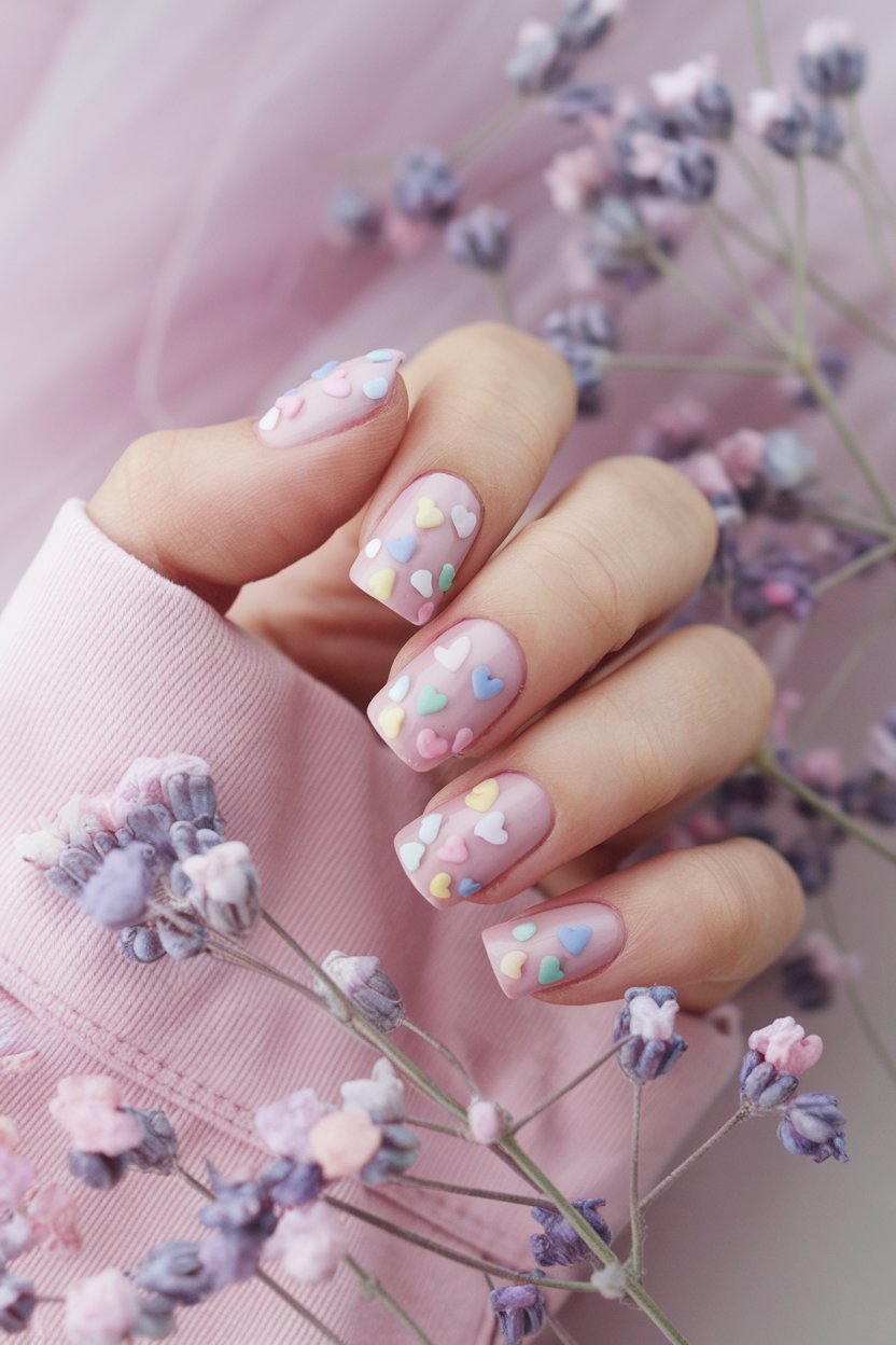 Add a little love to your nails by painting delicate hearts over a soft pastel base—it’s an instant recipe for dreamy, romantic vibes.