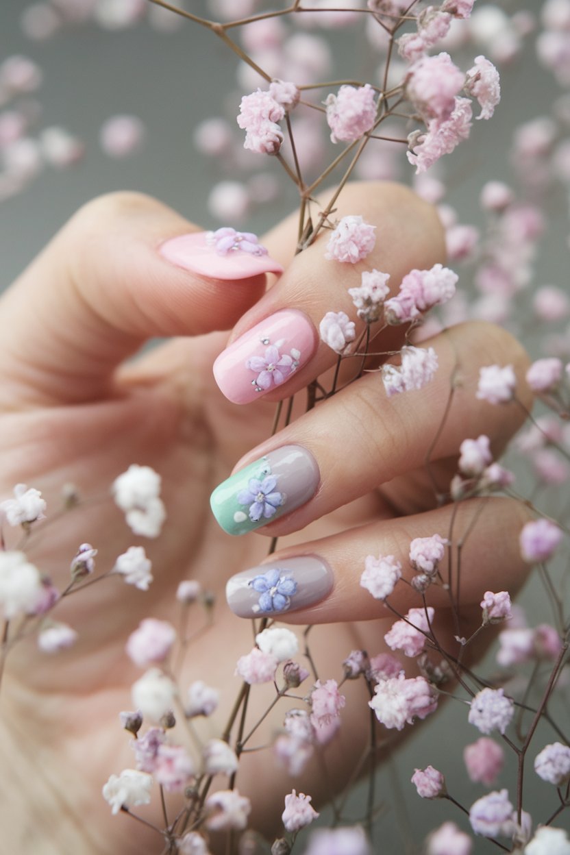 Add a touch of floral charm to your manicure by painting tiny pastel flowers on one or two accent nails. It’s a subtle yet beautiful detail that instantly softens your look.