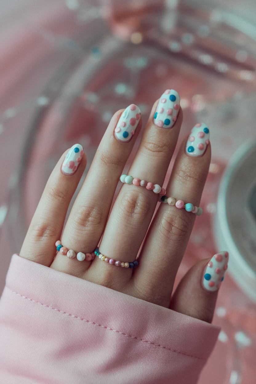 Just add tiny pastel dots over a clear or nude base for a soft, eye-catching detail.