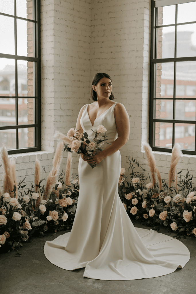 This gown celebrates daring elegance with its plunging neckline. The deep V elongates the torso, while the mermaid cut emphasizes curves. Brides who want to embrace sensuality often love this style. The neckline is balanced by the fitted bodice and dramatic flare, keeping the look refined. It feels modern and confident, perfect for bold personalities. Paired with minimal jewelry, the gown speaks for itself. Brides who wear this style often feel radiant and empowered.
