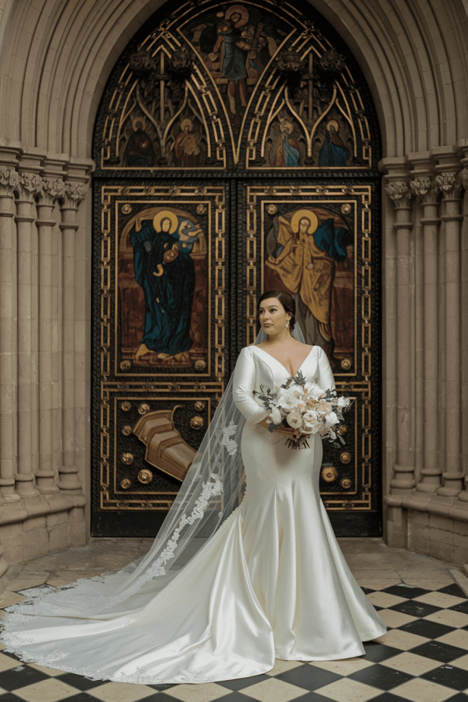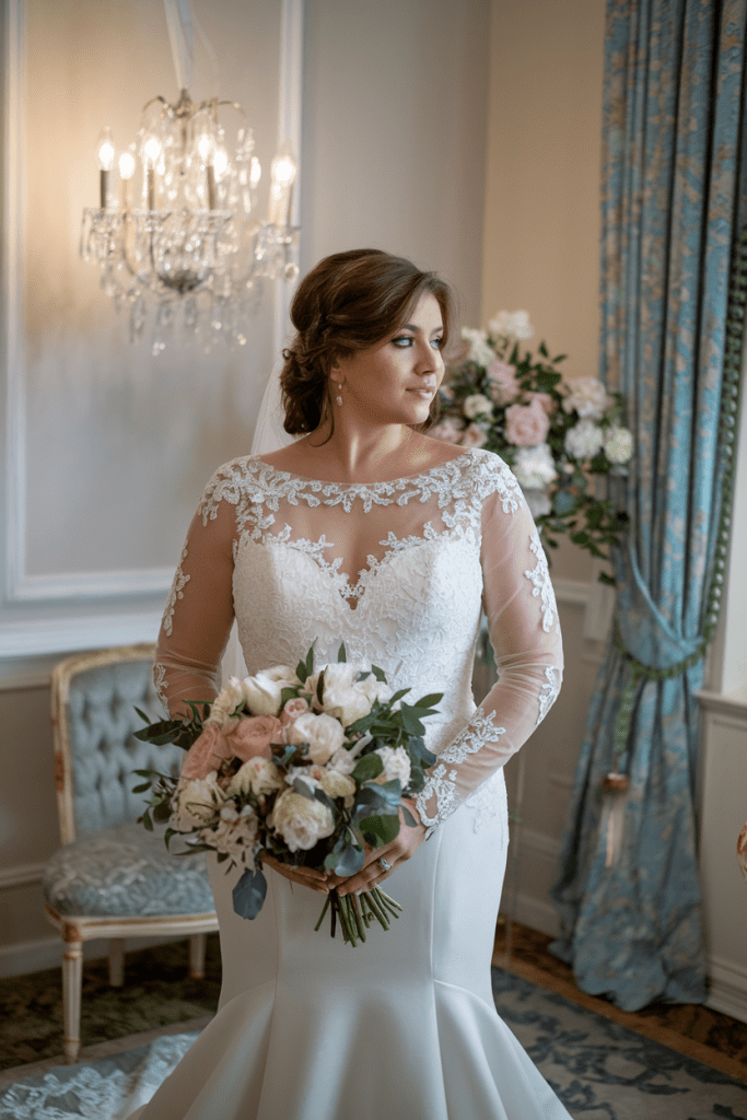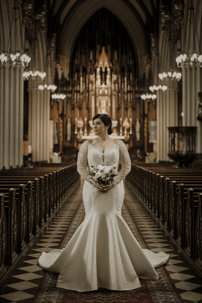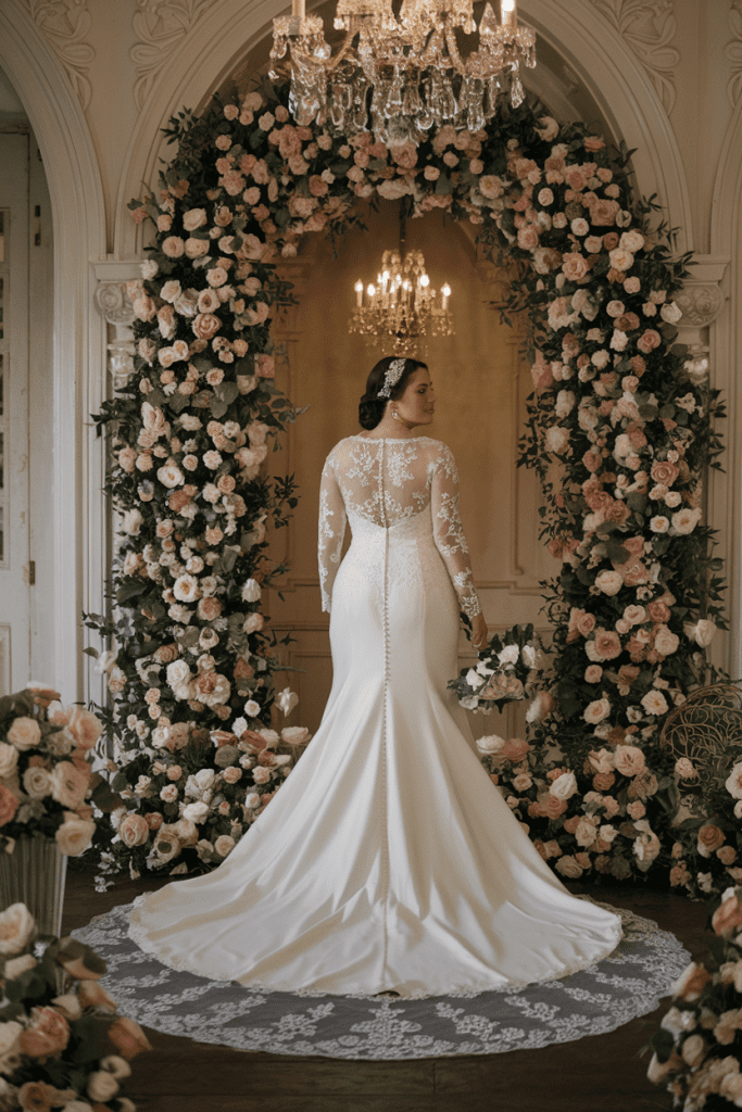 Sleeves bring drama and refinement to the mermaid silhouette. Whether made from sheer lace or sleek satin, they add coverage while keeping the design glamorous. Brides often choose this style for fall or winter weddings, where it feels seasonally appropriate. The fitted sleeves elongate the arms, while the flare of the skirt creates balance. It is a gown that feels regal, blending modesty with boldness. Paired with a cathedral veil, the look becomes unforgettable. Brides who wear this gown often feel both powerful and graceful.