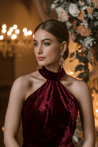 A velvet halter cocktail dress highlights shoulders and brings retro-glam vibes.