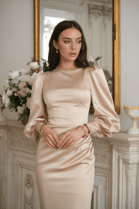 Satin in winter? Yes please. A long-sleeve satin mini dress strikes that balance between glam and practical—you’ll actually have your arms covered. Add pointed-toe pumps and a sleek clutch, and you’re set.