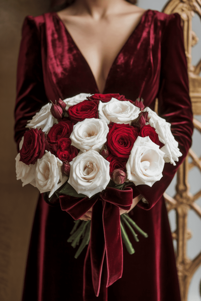 White roses with deep red blooms create a striking, regal bouquet perfect for fall or winter weddings.