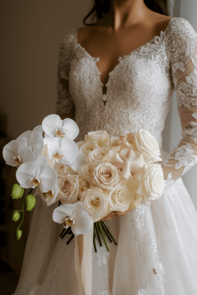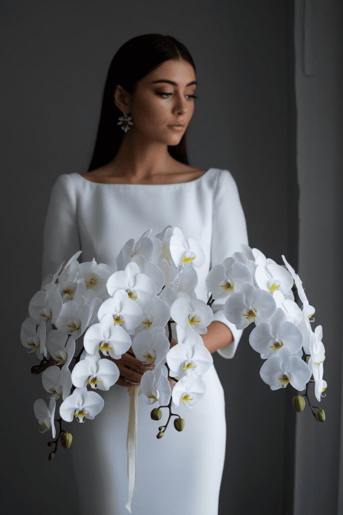 Skip the mix and go full orchid. A bouquet made entirely of white orchids is pure luxury vibes.