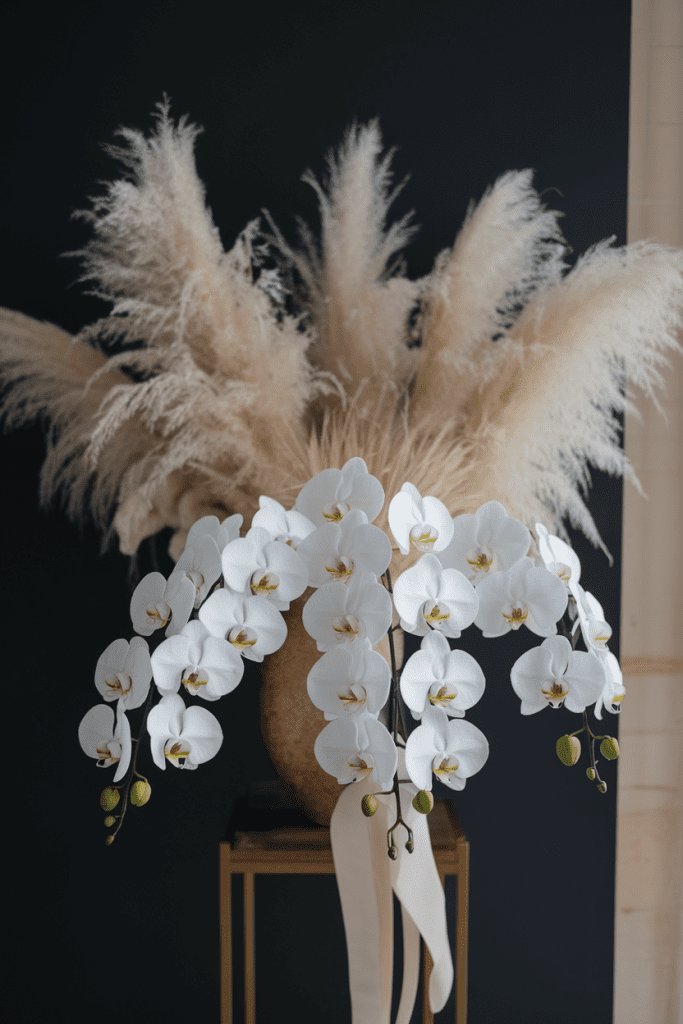 Pair orchids with soft pampas grass for an unexpected mix of sleek and boho-luxury. It feels fresh, modern, and Instagram-ready.