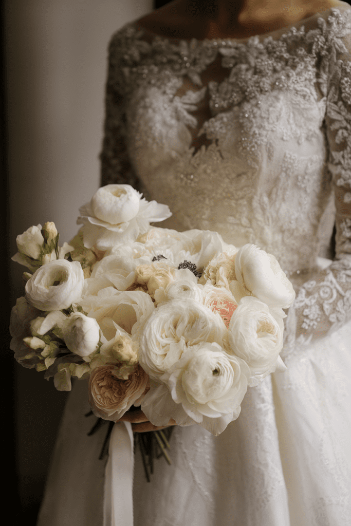 The ultimate luxury bouquet balances textures—roses, ranunculus, orchids—all in shades of white, cream, and champagne.
