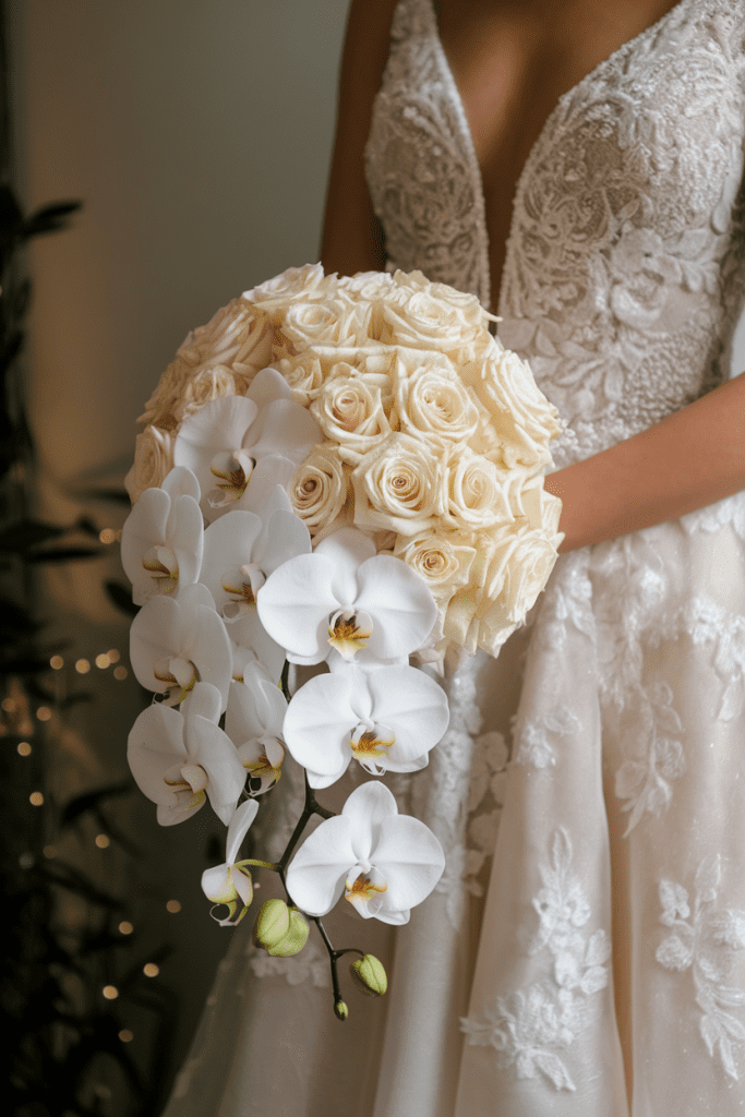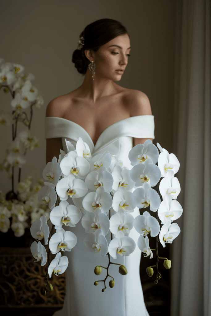 Few flowers whisper “luxury” quite like orchids. A cascading bouquet of white phalaenopsis orchids brings red-carpet energy straight to the aisle.