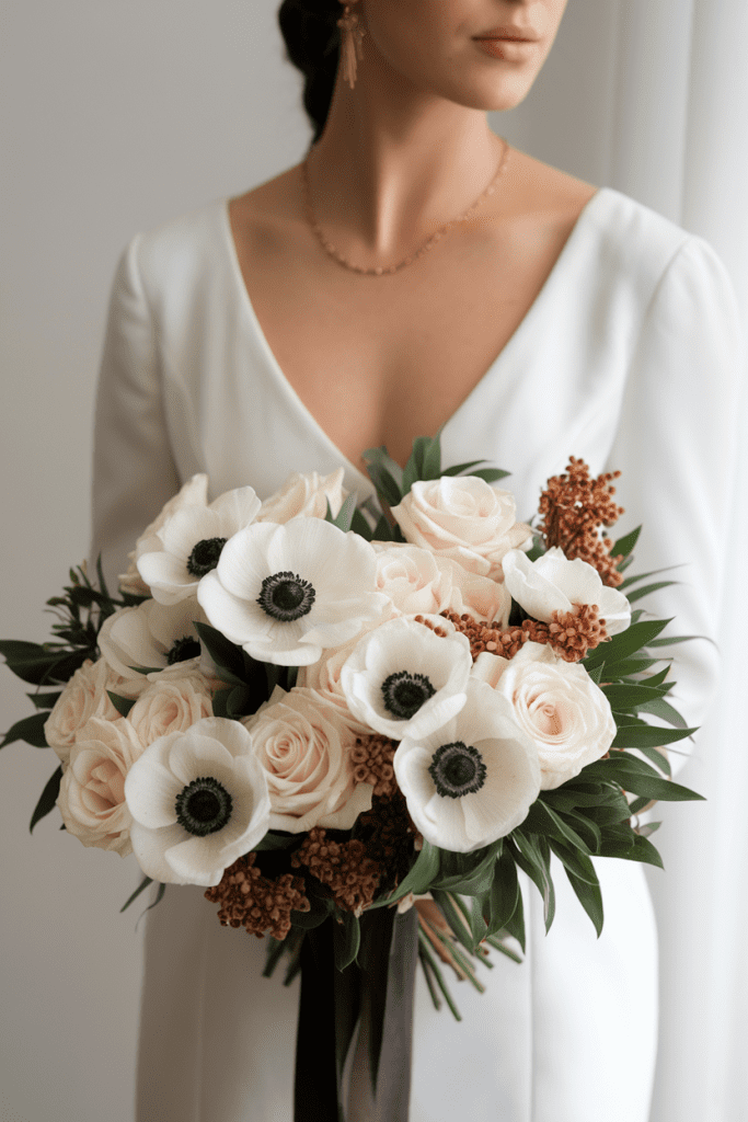 White anemones with black centers give instant editorial vibes. Pair them with roses or ranunculus for a bouquet that pops in photos.