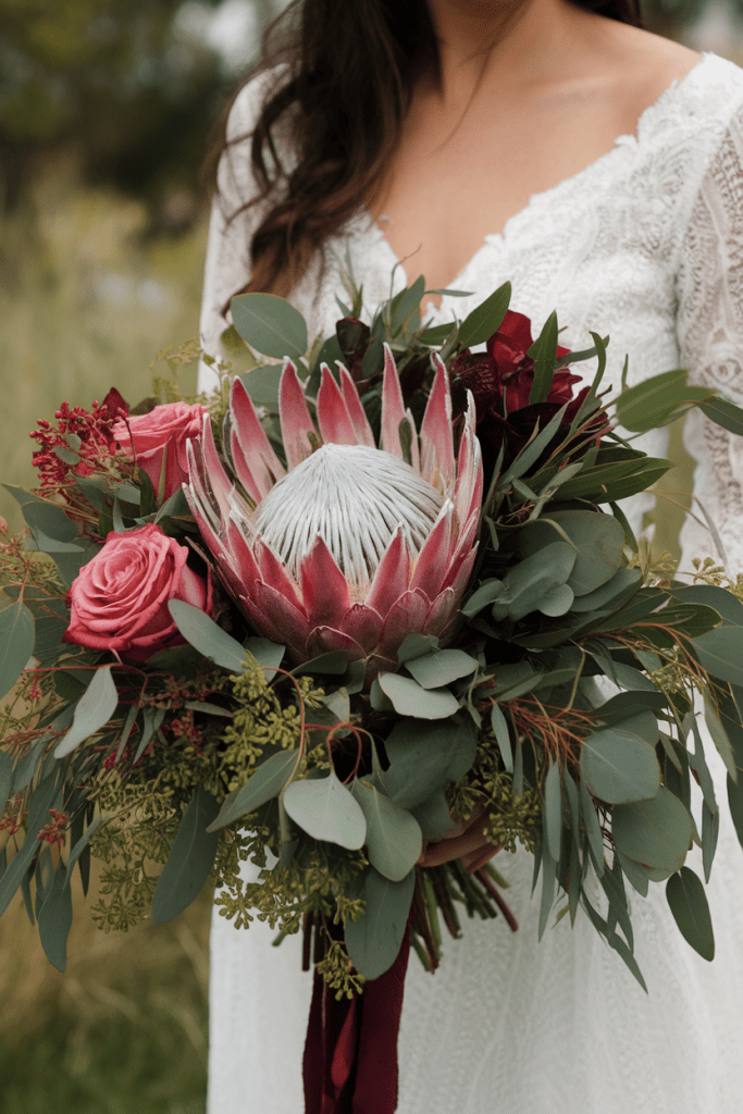 King proteas are not for wallflowers. Pair them with roses and eucalyptus for a bouquet that’s both exotic and regal.