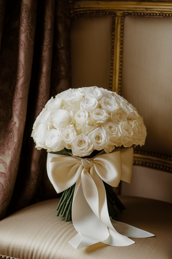 Classic, elegant, and impossible to mess up. A full bouquet of white roses tied with a silky oversized bow feels refined without trying too hard.