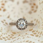 The ring in the image highlights a stunning cushion cut diamond, set in a delicate band. The ring’s vintage-inspired design pairs beautifully with lace and antique touches, enhancing its charm. Such bridal jewelry feels timeless and sophisticated, making it an ideal choice for romantic engagement rings.