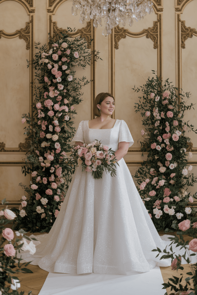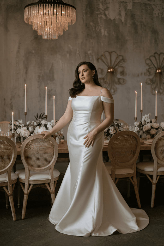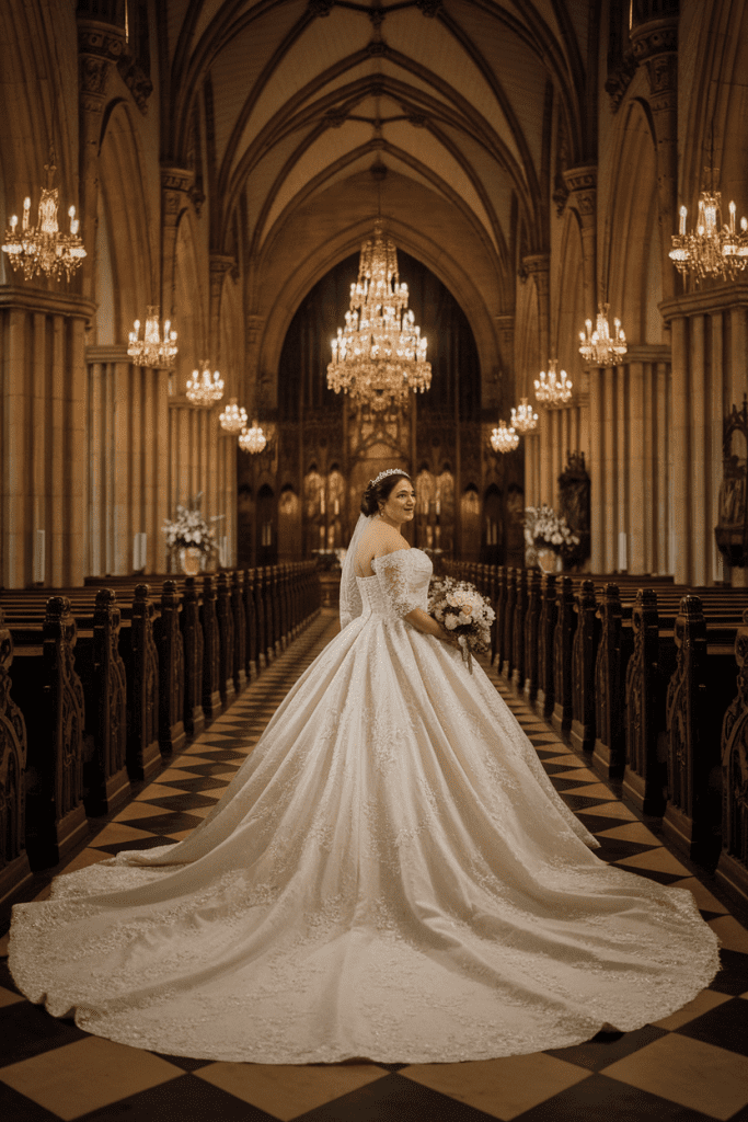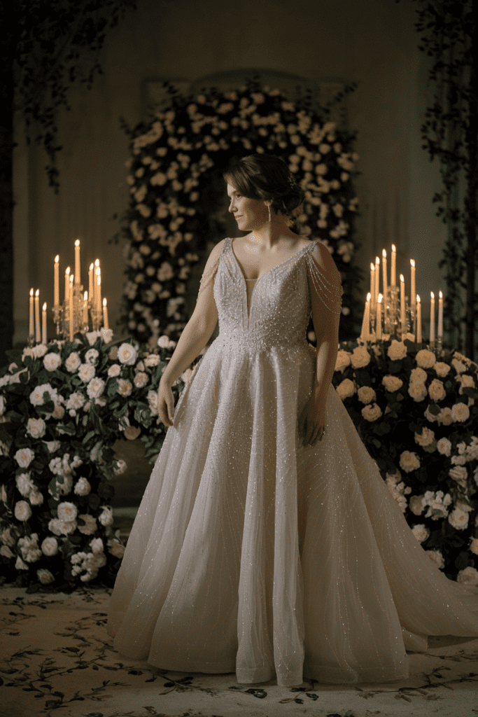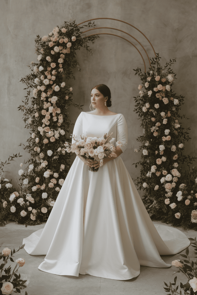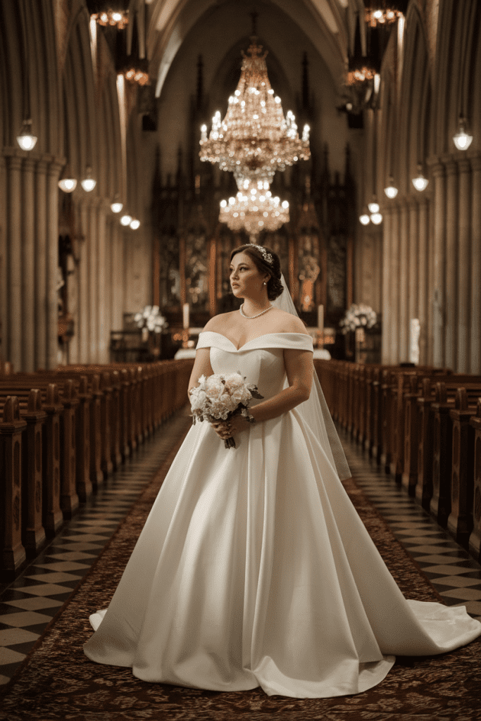 The A-line gown is a forever favorite for brides of every size. Its fitted bodice and gently flared skirt create balance, elegance, and ease of movement. Plus size brides especially love how it flatters without feeling restrictive. This style works in nearly any setting, from a grand cathedral to a garden ceremony. Its simplicity makes it easy to accessorize with veils, jewelry, or even bold shoes. Affordable versions look as graceful as designer gowns. Brides describe the look as elegant, versatile, and always appropriate. It is truly a design that never loses relevance.