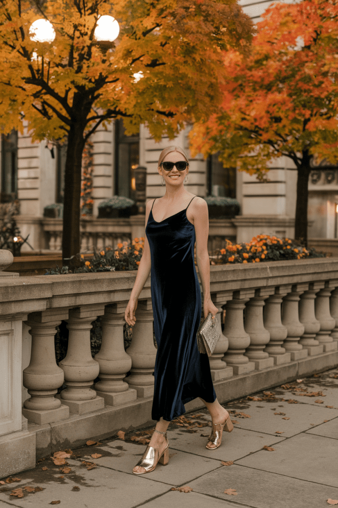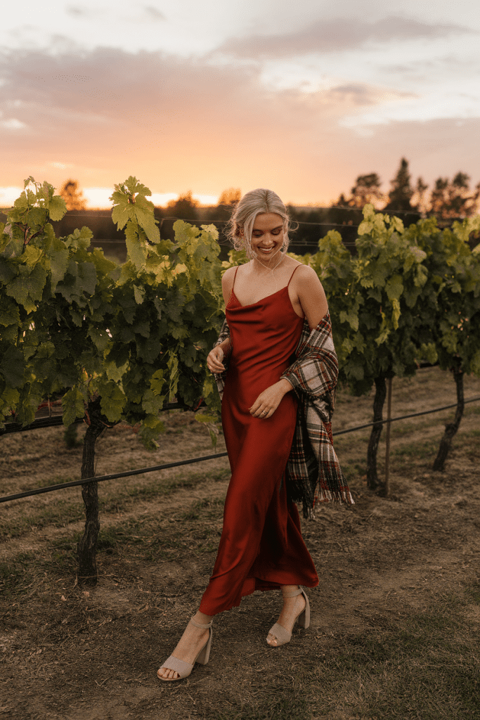 Rust is fall’s favorite shade. A satin slip glows in golden-hour photos and looks effortless.