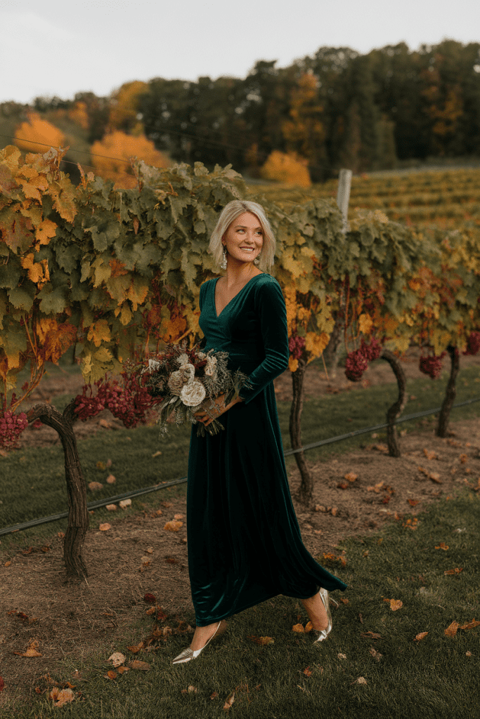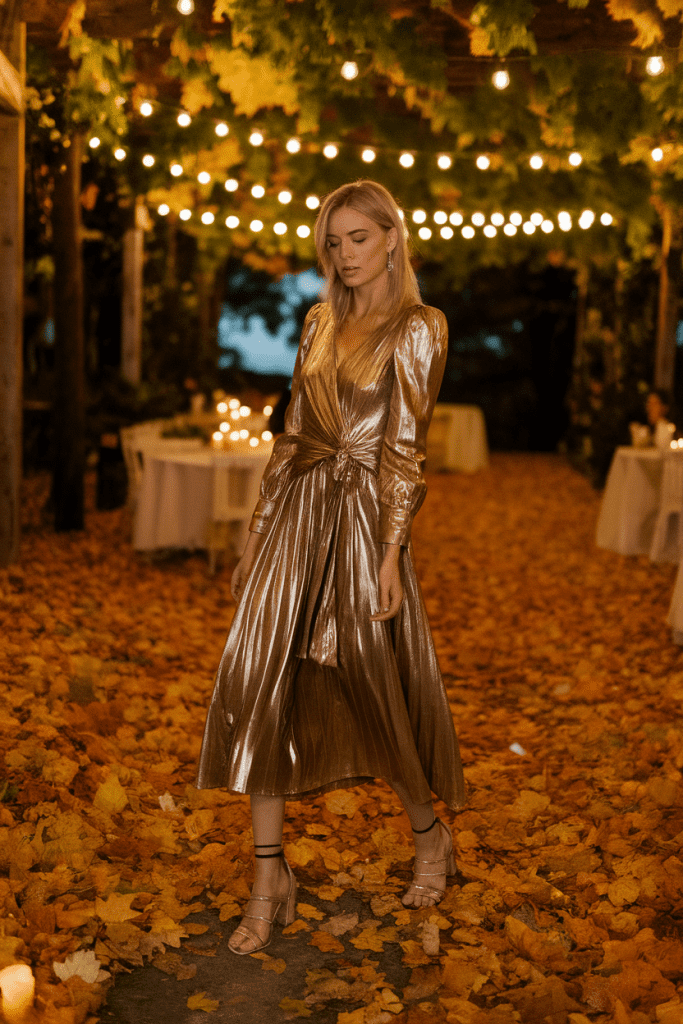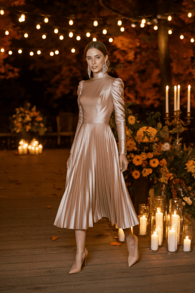 Fall weddings are basically made for fashion experiments. From jewel-toned velvets to mustard midis and champagne pleats, there’s no shortage of cozy fall looks to keep you stylish and comfortable. The key? Pick rich colors, textured fabrics, and smart layers. That way, you can enjoy golden-hour photos, dance all night, and stay warm without sacrificing chic.
