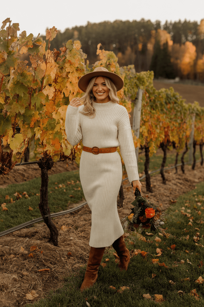 Sweater dresses can be wedding-worthy when styled right. Belt a cream knit midi for structure.