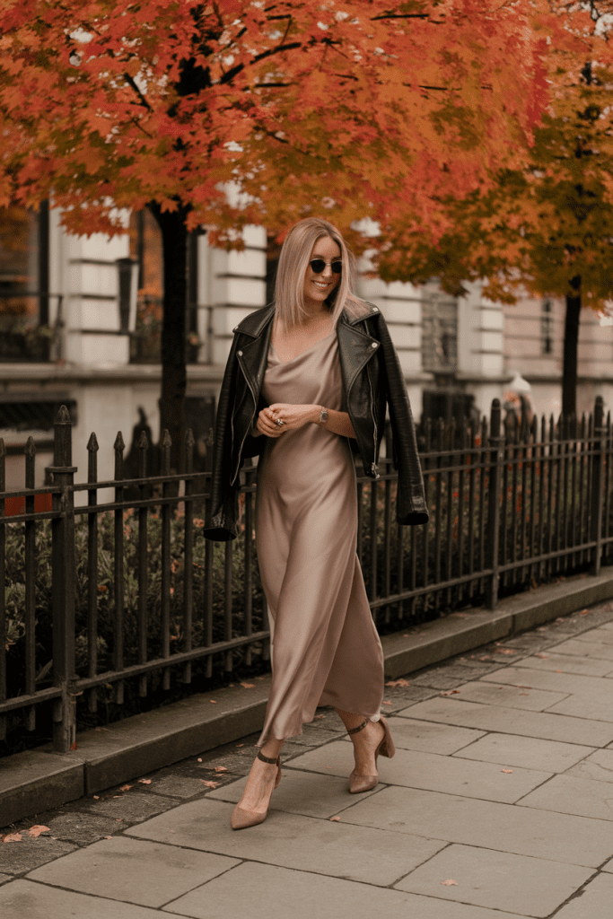 Slip dresses work year-round. For fall, add a leather jacket for contrast.