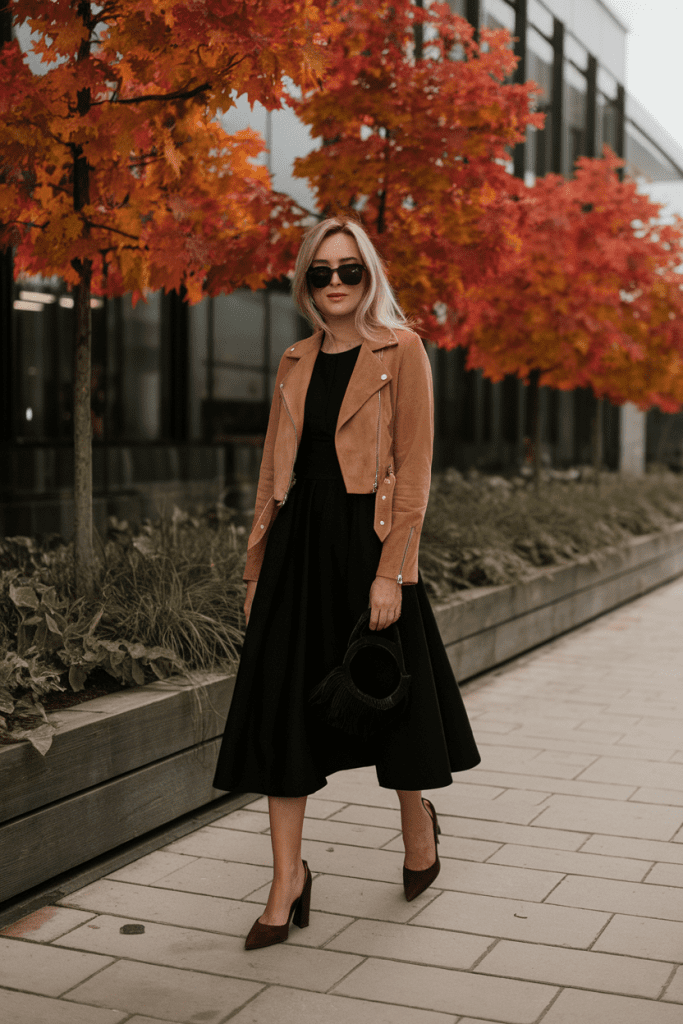 Black never fails, but fall layering makes it fresh. A cropped jacket adds personality.