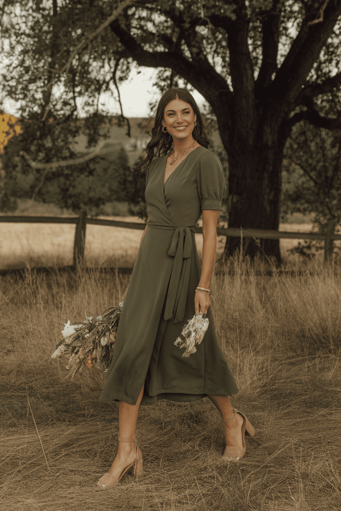 Olive green is earthy and sophisticated. A wrap midi in this shade feels seasonally chic.