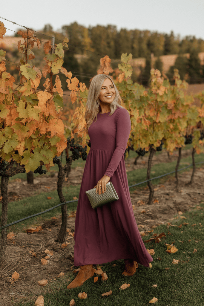 Plum is moody and dramatic, perfect for chilly evenings. Long sleeves keep you cozy.