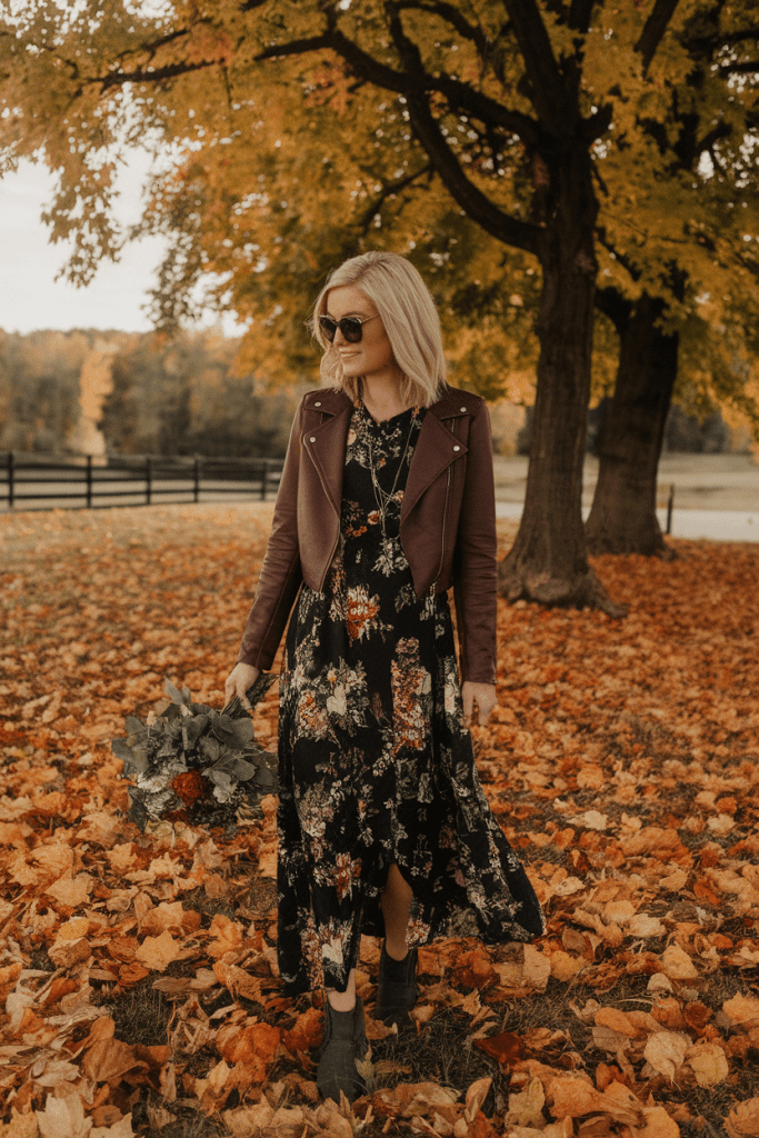 Florals don’t retire after summer. Darker prints with moody tones feel autumn-perfect.