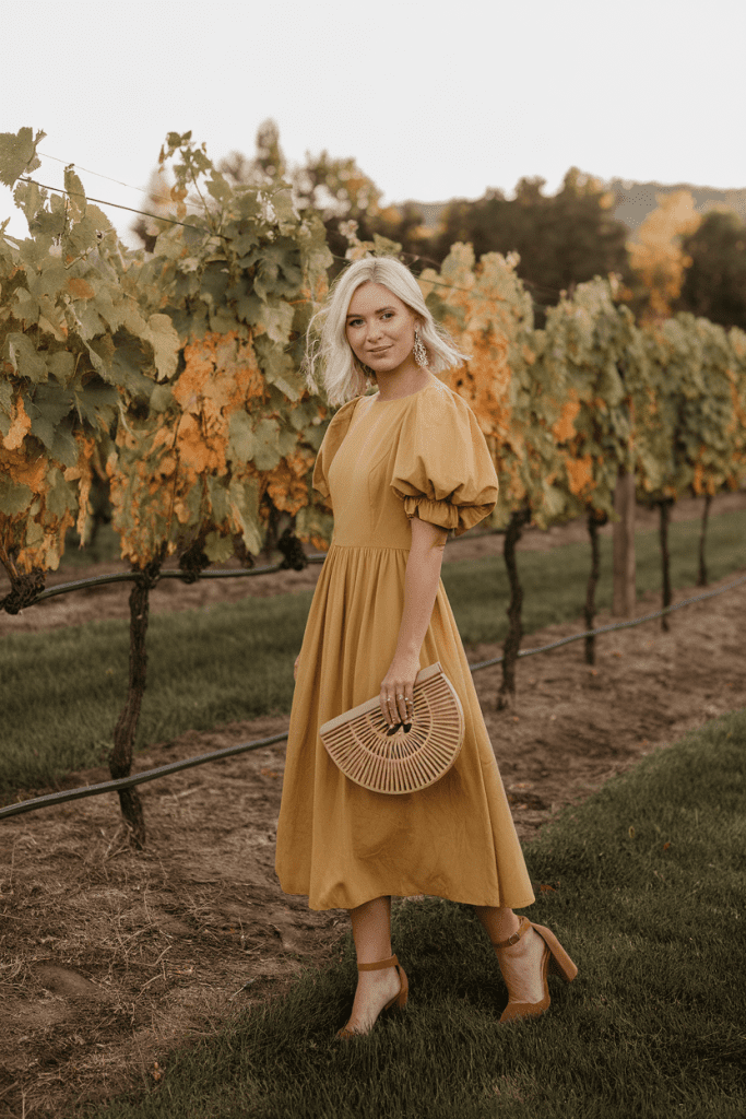 Mustard brings bold energy to chilly autumn days. Puff sleeves make it playful while keeping it wedding-ready.