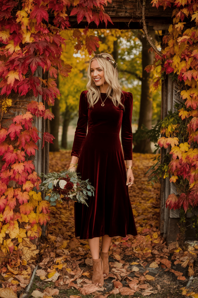Velvet and burgundy are basically fall’s dream team. A velvet midi is warm, elegant, and perfect for rustic venues.